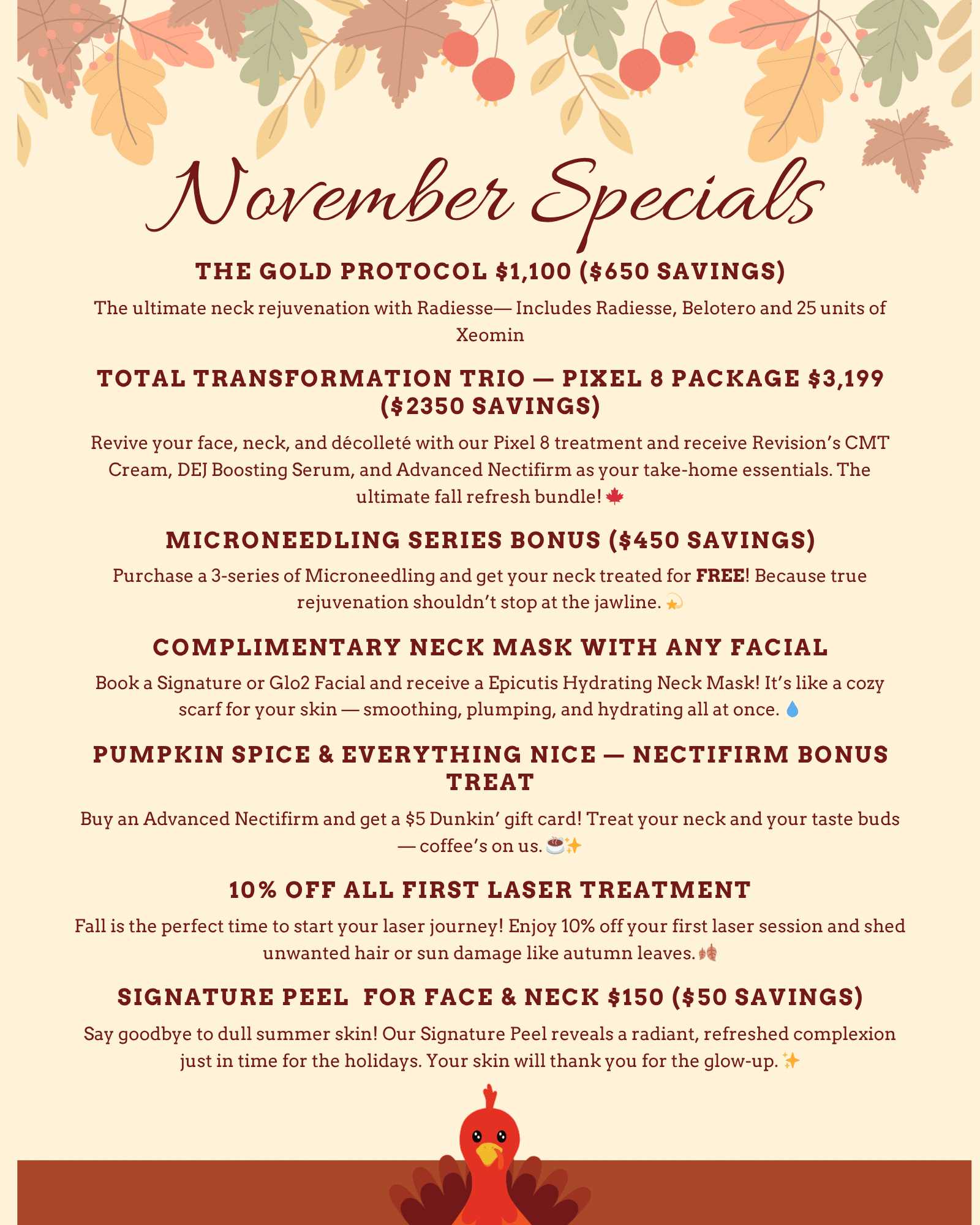 The Thirsty Skin Thursday Facial will include : Cleansing of the skin, then a facial mask will be applied, then mask removed and LED Infrared light therapy will be applied, then moisturizer and sunscreen applied. This treatment will take about 45 mins.